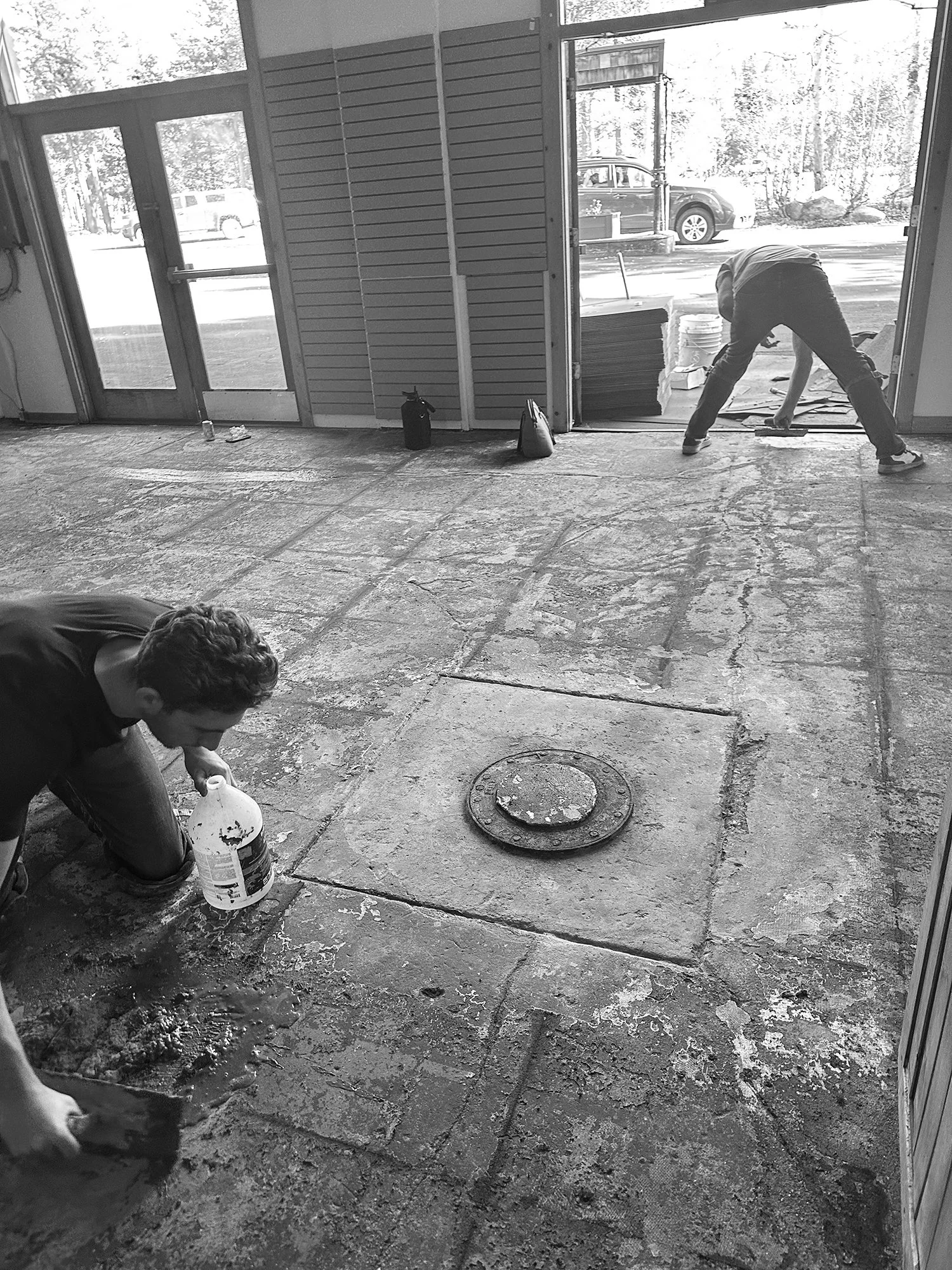 While new store carpet was being installed, the old car mechanic lifts were exposed.
