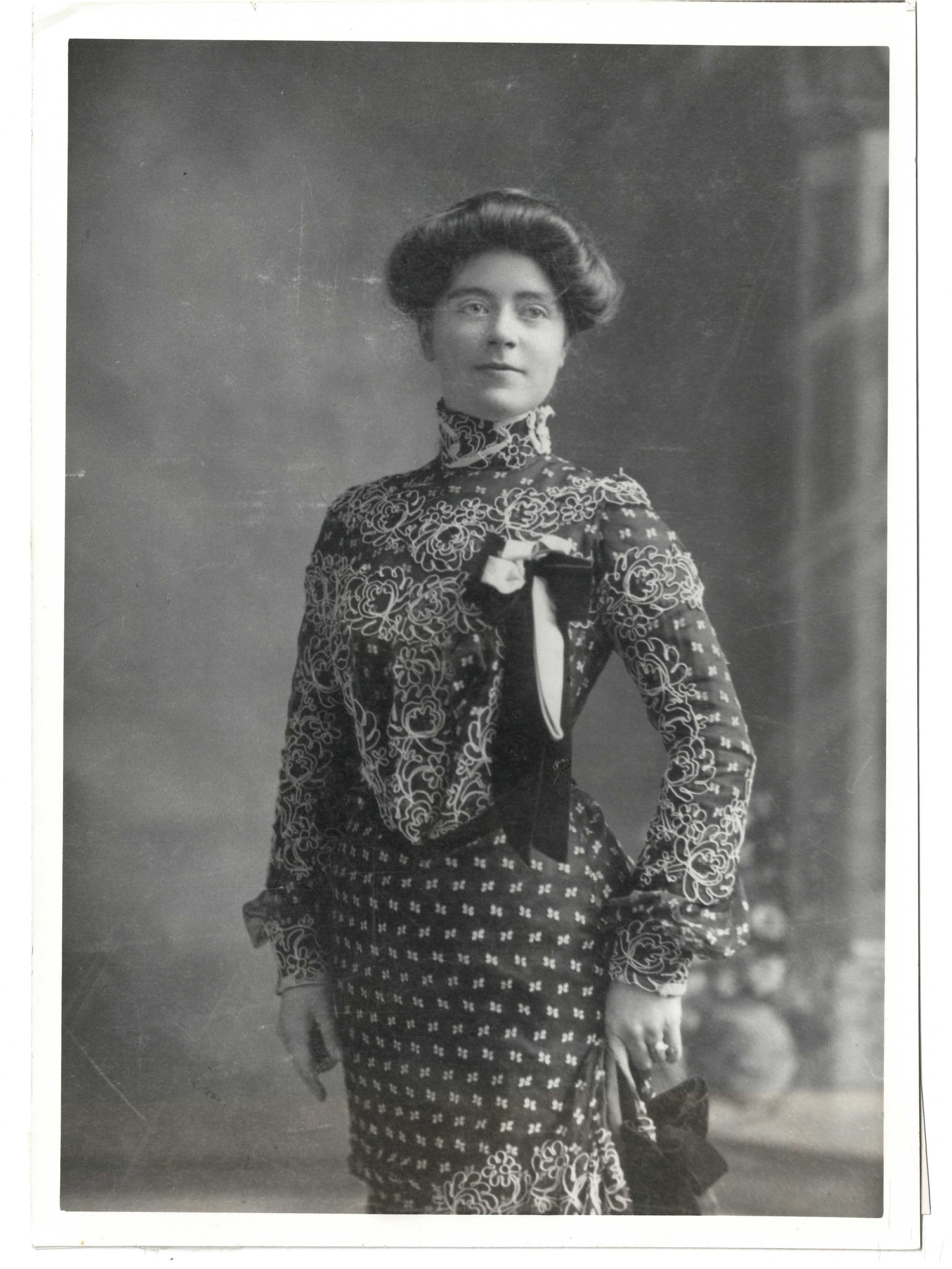 Harvey Blood married Elizabeth Gardner in 1876, and a year later Elizabeth gave birth to their only child and daughter, Rebecca, nicknamed Reba. Like most women from the era, we don’t know much about Reba, and even less about her mother. We know that Reba married twice, divorced once, widowed once, had three children, died in 1959 and was buried in the Altaville Protestant Cemetery in Angels Camp alongside her parents, second husband and son. Jung published two black and white photos of Reba archived by the Calaveras County Historical Society. In one photo she looks like she’s about ten-years old, casually resting on a rustic fence with mountain scenery in the background. She looks off in the distance with her long, waist-length curly hair pulled back from her face. In the second photo, she exudes the confidence of a young and respected woman, her long hair rolled into a fashionable bun, standing ready to take on the world, dressed to the nines. Look closely and see an engagement or wedding ring on her left hand.