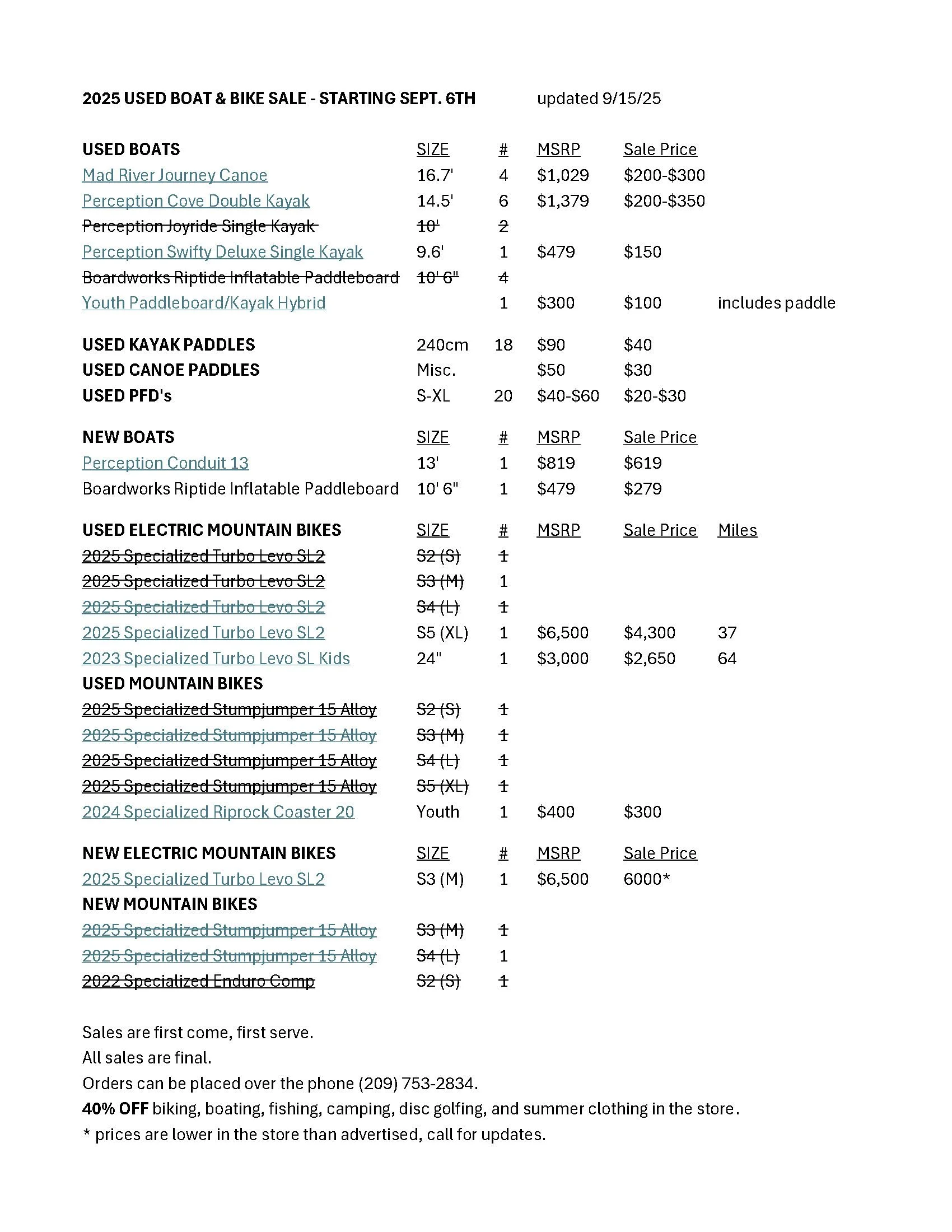 We are discounting both new and used boats and mountain bikes. This is an excellent opportunity to purchase lightly used equipment at considerable savings. In addition, 40% OFF on biking, boating, fishing, camping, disc golfing, and summer clothing in the store. For those unable to attend in person, we can accept orders over the phone (209.753.2834). This sale will continue through September or until supplies last. Cheers!